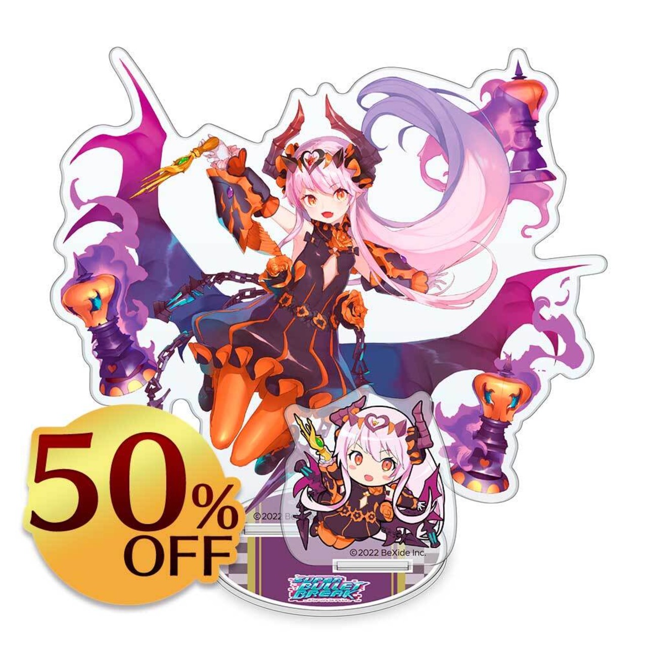 仮装をした「キング・ダクトリ」の 等身・ちびキャライラストが同時に楽しめる、組立式のアクリルフィギュアです!
